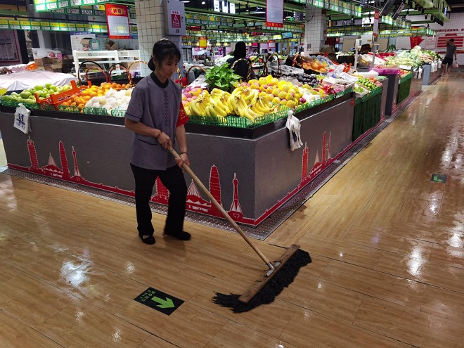 農(nóng)業(yè)公司安全小組人員立即啟動防汛安全應急預案,對市場易積水點、漏水點、排水口進行檢查清理,做到積水及時排放,防止下水口堵塞、雨水積存,并鋪防水腳踏墊,全天候清掃保潔,豎立標識,引導市場商戶、購物群眾注意防滑安全。對容易出現(xiàn)水電火災的插排、線路、交換點等進行防水處理,防止火災、觸電現(xiàn)象發(fā)生,及時發(fā)布災害預警信息和防災避災辦法到市場商戶群,督促各商戶從業(yè)者積極做好氣象災害預防工作,做好市場必需品供應,保障惡劣天氣物價穩(wěn)定。